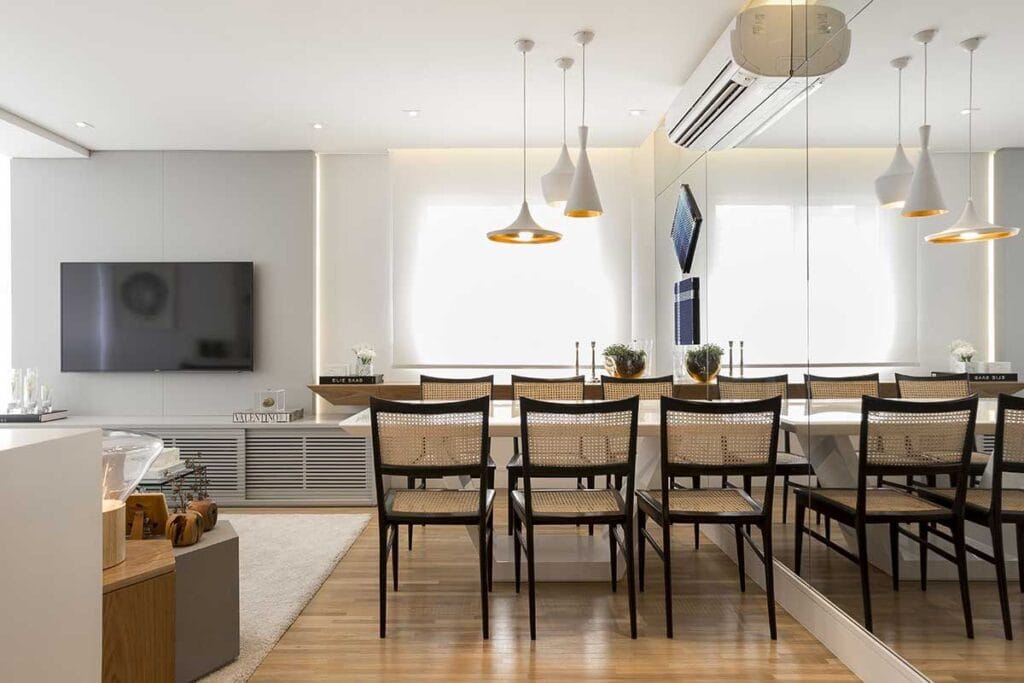 Os espelhos são clássicos na decoração de espaços pequenos. Eles criam uma sensação de continuidade, refletindo a luz e os elementos do ambiente, o que faz com que o espaço pareça maior. Uma parede espelhada ou um espelho grande posicionado estrategicamente pode fazer toda a diferença.